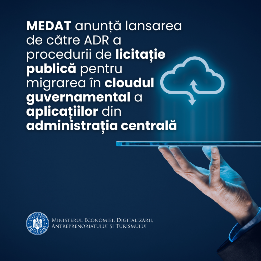 Ministerul Economiei, Digitalizării, Antreprenoriatului și Turismului (MEDAT) anunță lansarea procedurii de achiziție de servicii asociate migrării unor Aplicații IT în Cloud-ul Privat Guvernamental al României (CPG), în contextul implementării Planului Național de Redresare și Reziliență (PNRR). În acest proces, autoritatea contractantă este Autoritatea pentru Digitalizarea României din subordinea MEDAT.